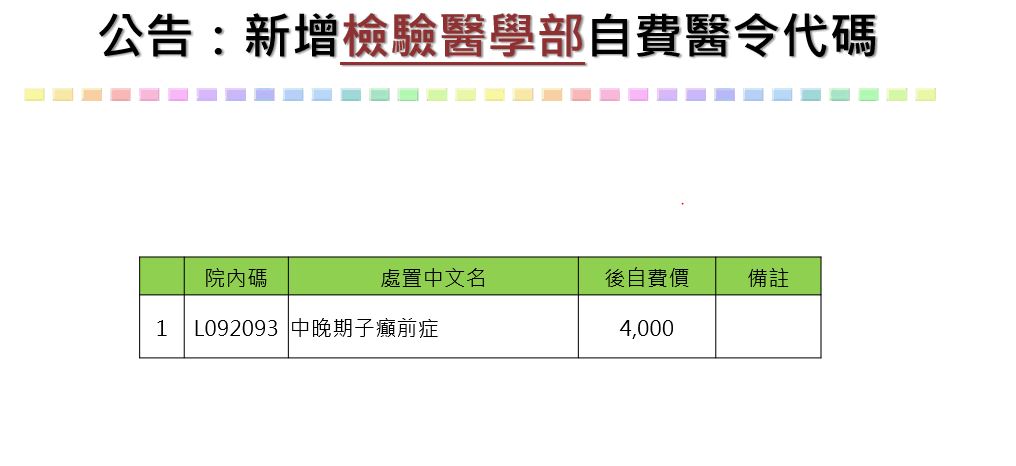 公告編號11:新增【委外檢驗項目】L092093 Mid-late preeclampsia中晚期子癲前症