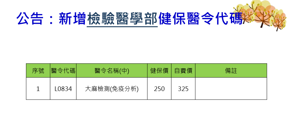 公告編號12:新增【委外檢驗項目】L0834 Cannabinoids(EIA) 大麻檢測(免疫分析)