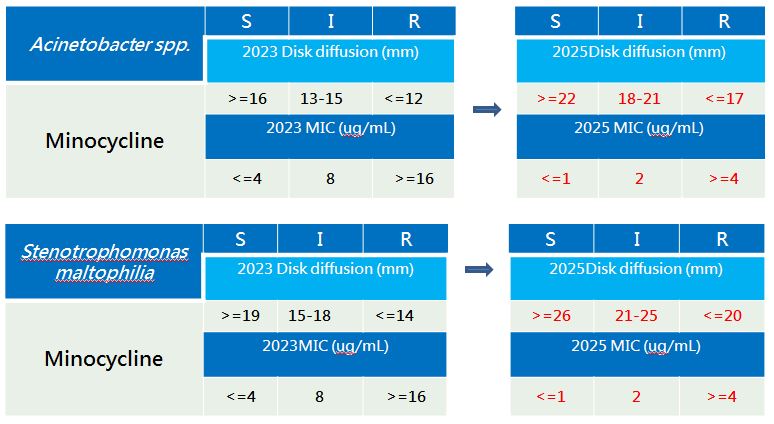 - 更新 Acinetobacter spp. 及 Stenotrophomonas maltophilia 的 Minocycline MIC 及Disk Diffusion Method 判讀標準