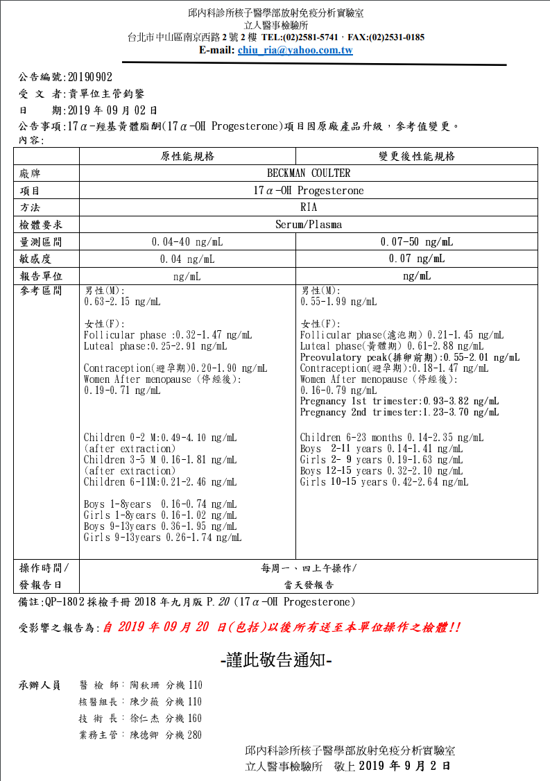 公告編號14:【委外檢驗項目 】L0981 17-α-Hydroxyl Progesterone 參考區間變更