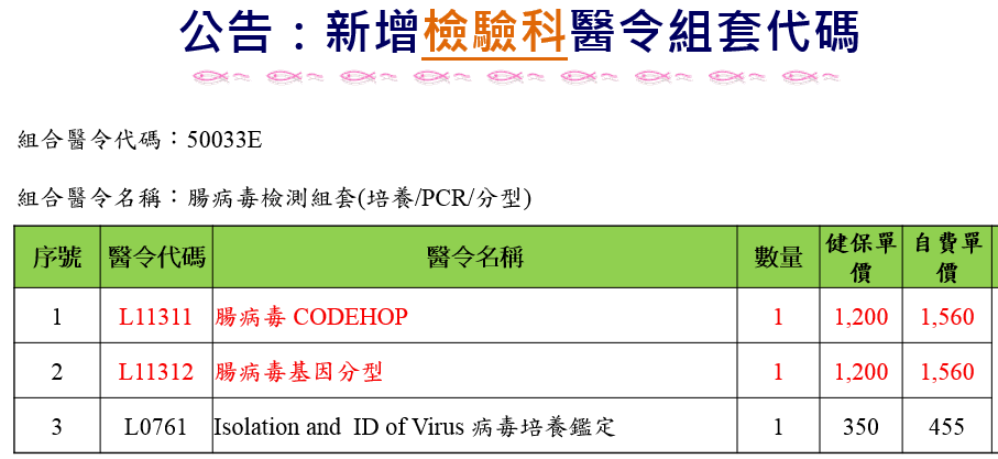 公告編號3: 新增【檢驗醫學科】健保組合醫令「腸病毒檢測組套(培養/PCR/分型)」