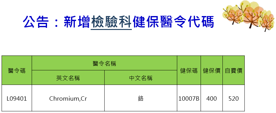 公告編號5: 新增【檢驗醫學科】健保醫令「L09401 鉻」