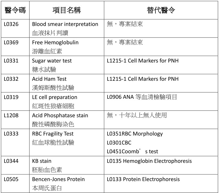 以下醫令因使用率低、替代醫令具較佳敏感度與特異性,故停用原醫令,並建議改用下表之替代醫令進行檢驗