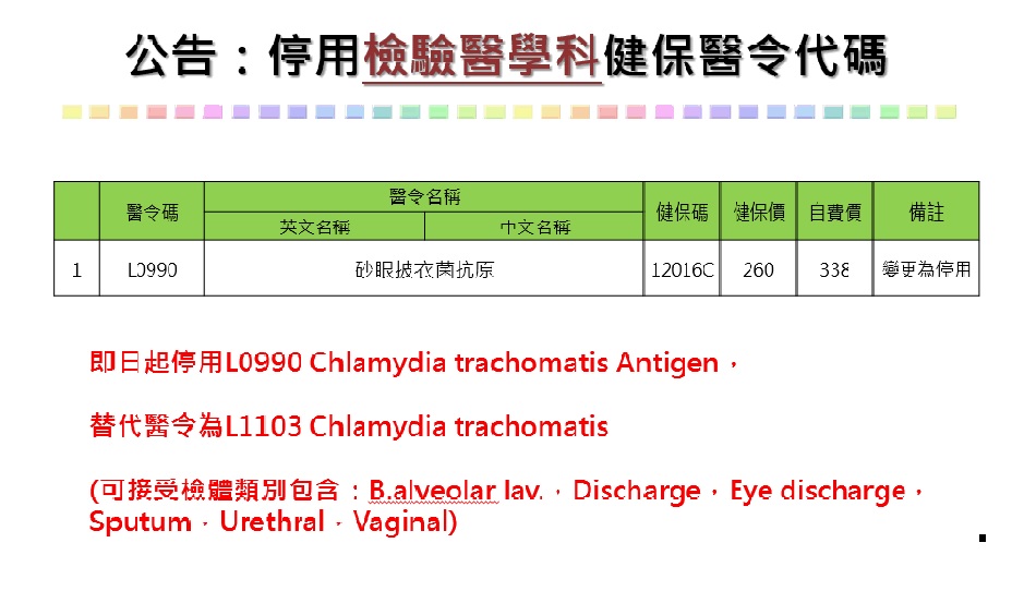 公告編號10: 停用【檢驗醫學科】健保醫令代碼「L0990 砂眼披衣菌抗原」