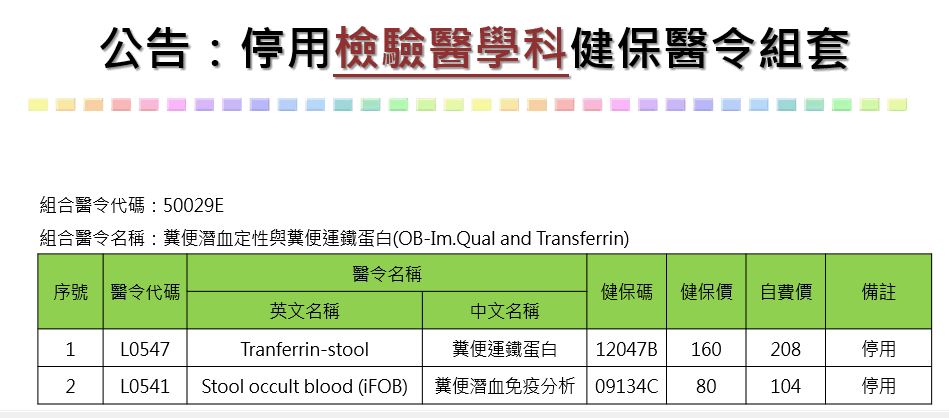 公告編號11: 停用【檢驗醫學科】健保醫令代碼「L0547、L0541 糞便運鐵蛋白、糞便潛血免疫分析」