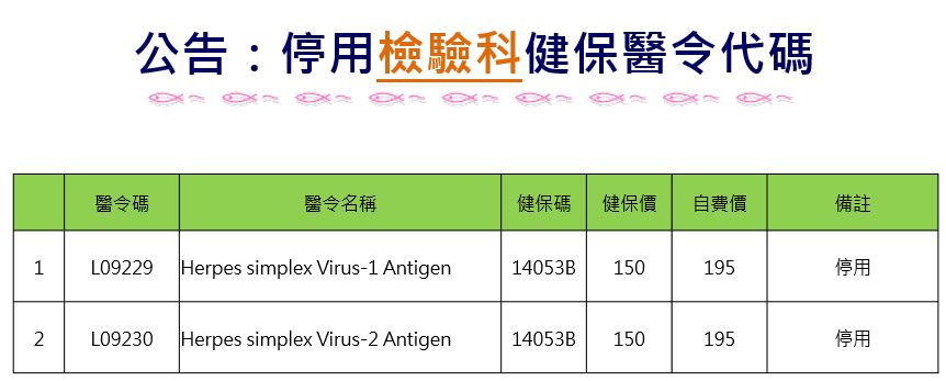 公告編號14: 停用【檢驗醫學科】健保醫令代碼「L09229、L09230 Herpes simplex Virus Antigen 1、2」