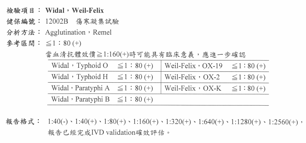 2.109年10月21日起,檢驗項目Widal,Weil-Felix傷寒凝集試驗變更報告格式,相關內容如下: