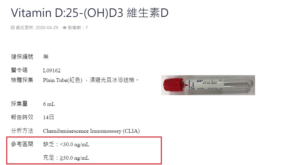 參考區間:缺乏: < 30.0 ng/mL;充足: ≧ 30.0 ng/mL