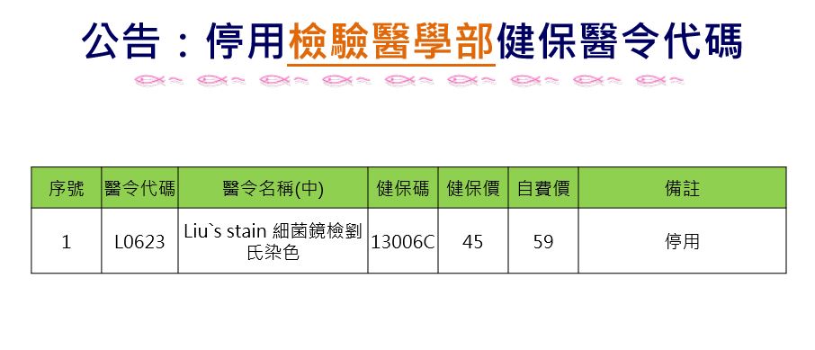 公告編號03:停用 L0623 Liu's stain細菌鏡檢劉氏染色