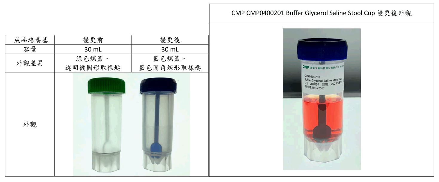 1. 因新冠病毒疫情影響物料供應,CMP0400201 Buffer Glycerol Saline Stool Cup 原使用 30mL PP 材質容器盛裝,即日起變更容器外觀。