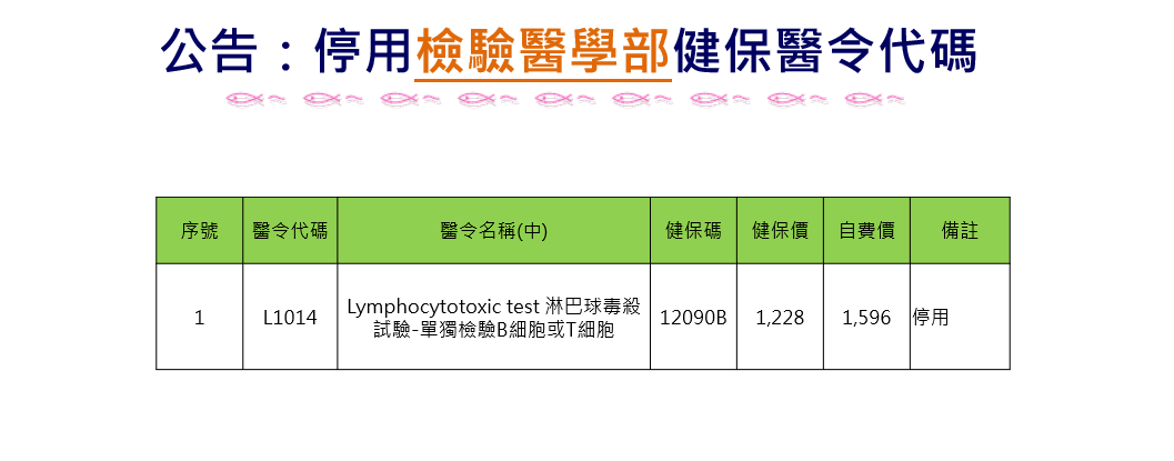 公告編號12:停用【骨髓移植核心實驗室檢查項目】L1014 淋巴球毒殺試驗-單獨檢驗B細胞或T細胞