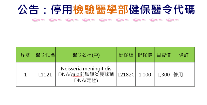 公告編號14:停用【分生檢驗項目】L1121 腦膜炎雙球菌DNA(定性)