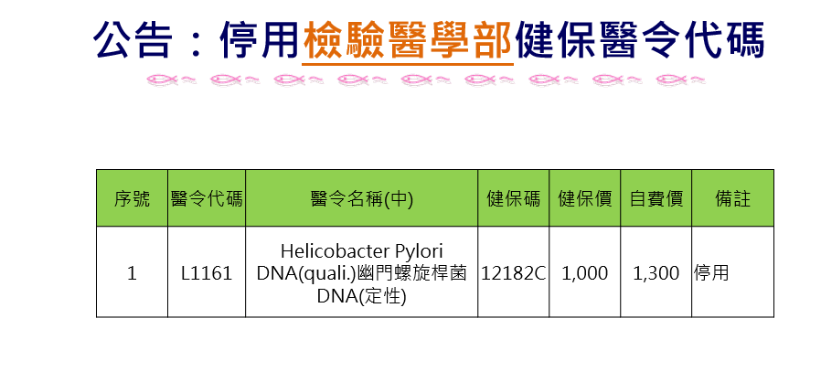 公告編號15:停用【分生檢驗項目】L1161 幽門螺旋桿菌DNA(定性)