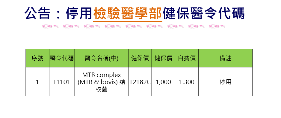 公告編號24:停用【檢驗醫學部】健保醫令代碼-「L1101 MTB complex (MTB & bovis) 結核菌」