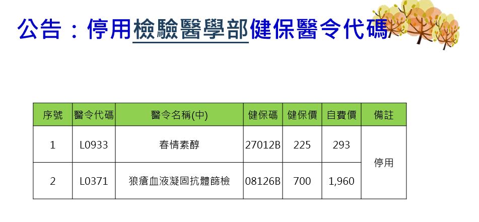 公告編號30:停用【檢驗醫學部】健保醫令代碼-「L0933 春情素醇」等二項