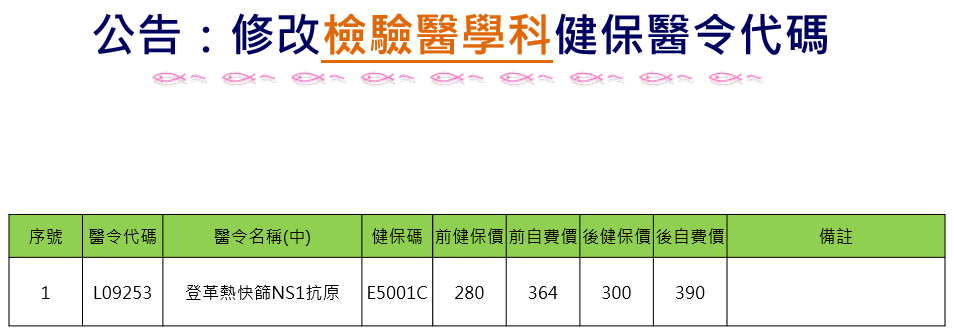 公告編號55:新增【檢驗醫學科】健保醫令代碼-「L09253登革熱抗原NS1抗原」