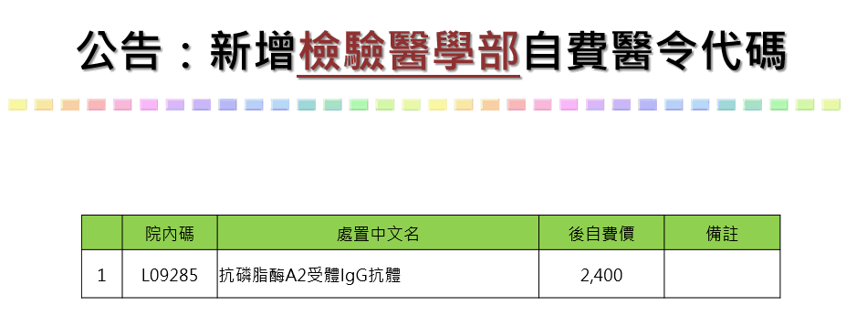 公告編號57:新增【檢驗醫學科】健保醫令代碼-「L09285 抗磷脂酶A2受體IgG抗體」