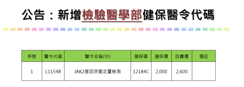 公告編號02:新增【檢驗醫學科】健保醫令代碼- L11548 JAK2 基因突變定量檢測
