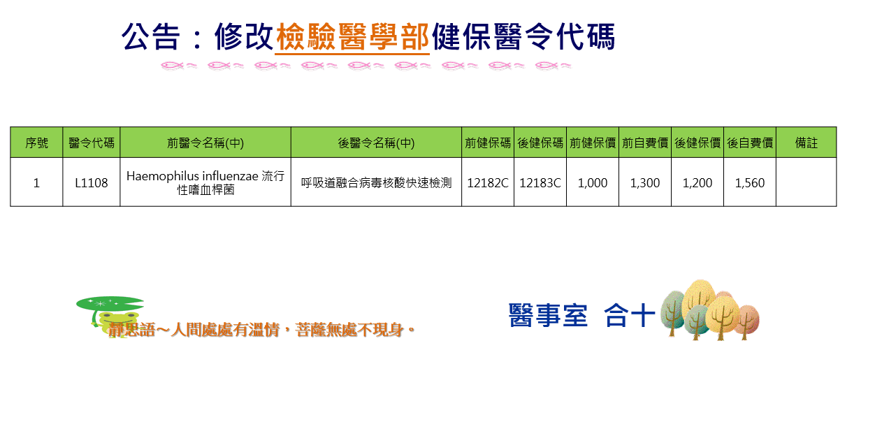 公告編號10:修改【檢驗醫學部】健保醫令代碼-「L1108 呼吸道融合病毒核酸快速檢測」