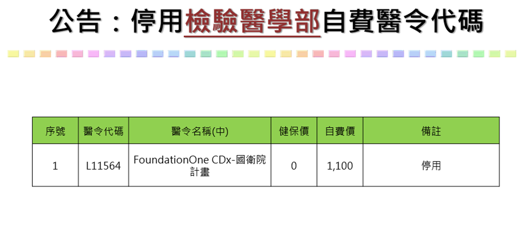 公告編號17:停用【檢驗醫學部】自費醫令-「L11564 FoundationOne CDx國衛院計畫」
