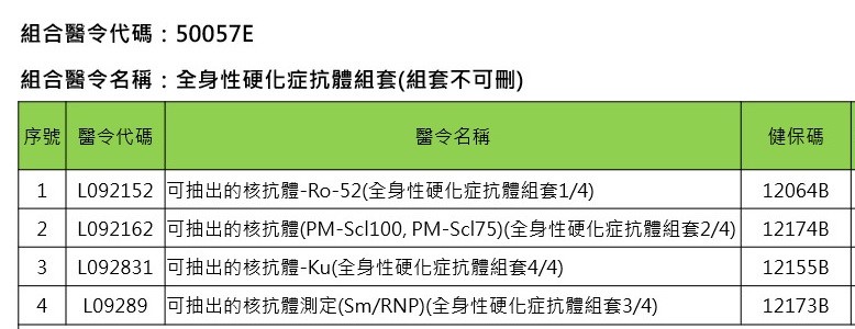 詳細檢驗內容可查看檢驗項目頁面:Systemic Sclerosis Abs 全身性硬化症抗體篩檢 (50057E組套)