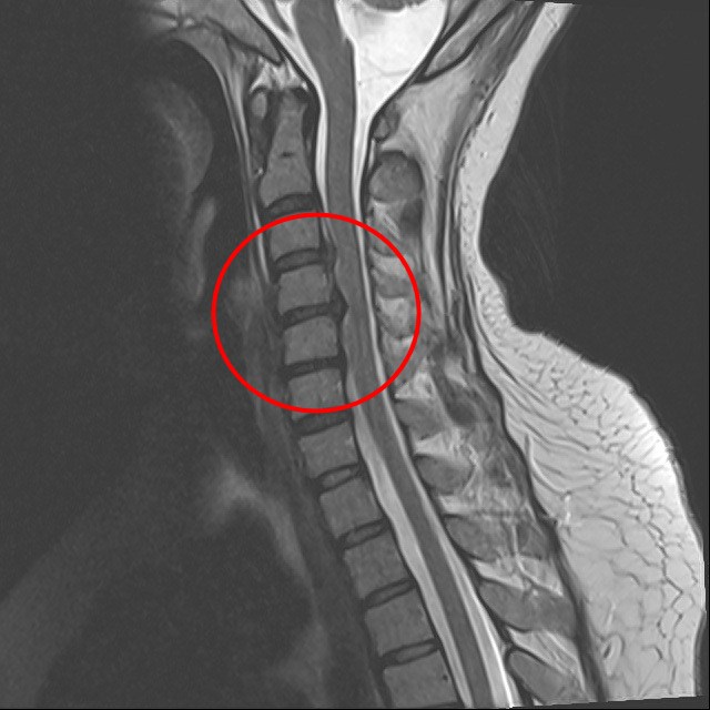 楊小姐的頸椎第三節到第五節間的椎間盤軟骨已經破裂,壓迫到脊椎神經。