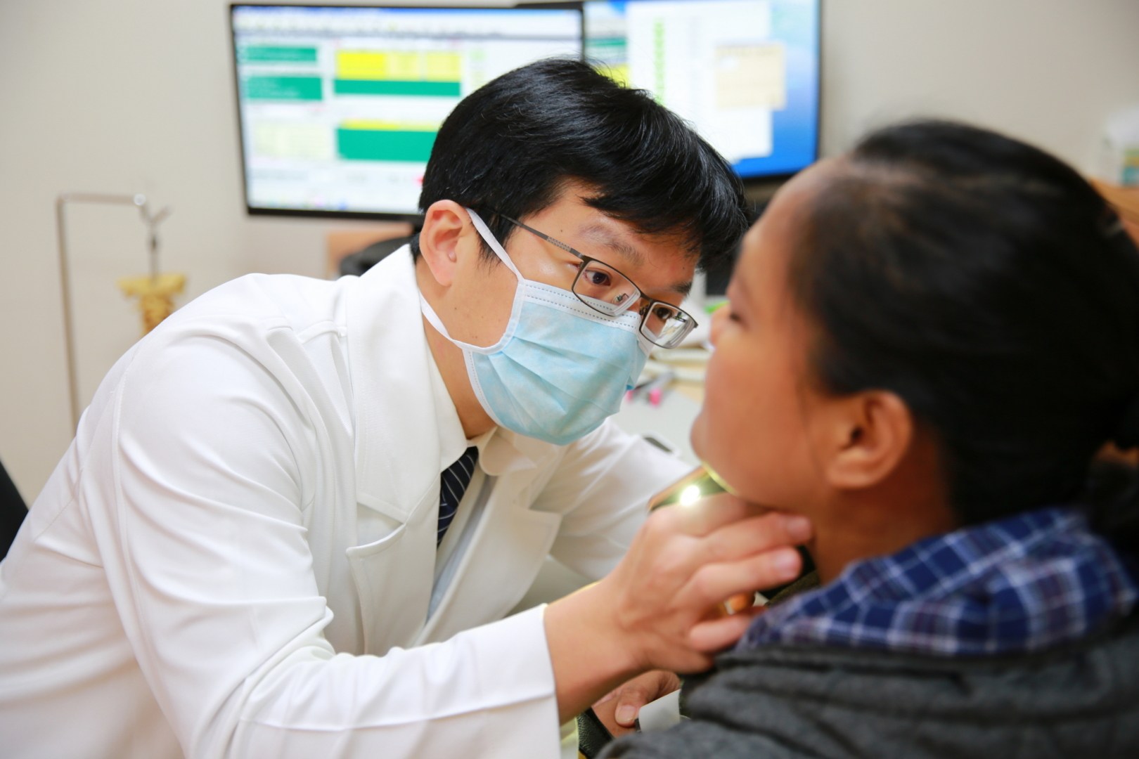花蓮慈濟醫院神經脊椎微創外科主任洪祥益(左)檢查楊小姐的傷口狀況。