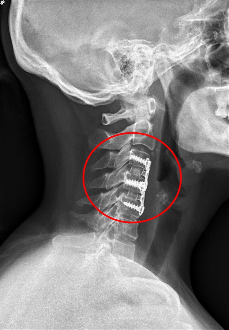 因為楊小姐的頸椎第三節到第五節間的椎間盤軟骨破裂,已經壓迫到脊椎神經,引起交感神經症狀,導致她只要一躺平,胸悶、胸痛的症狀就更嚴重。為了改善她的症狀,我使用頸椎微創手術「頸椎間盤切除及融合手術」移除破裂的兩塊椎間盤,再使用融合器,穩定頸椎讓骨頭得以生長。