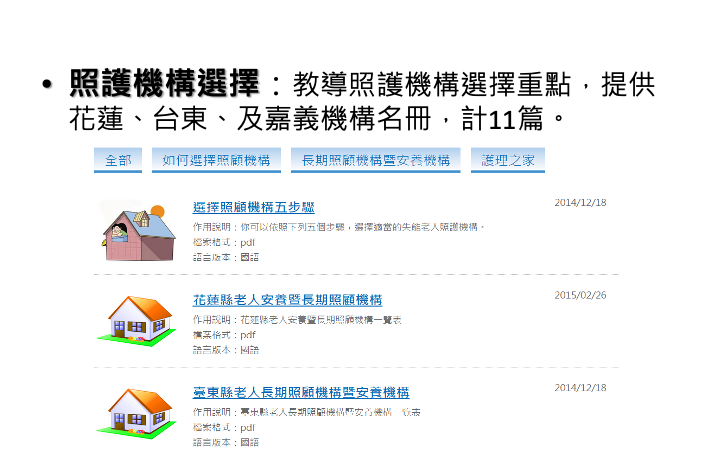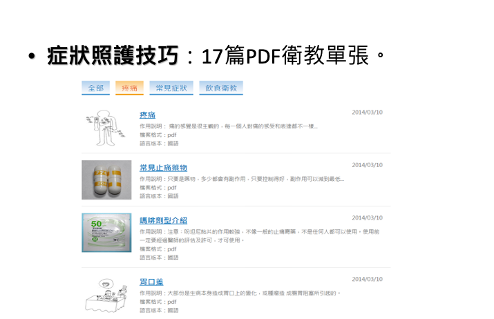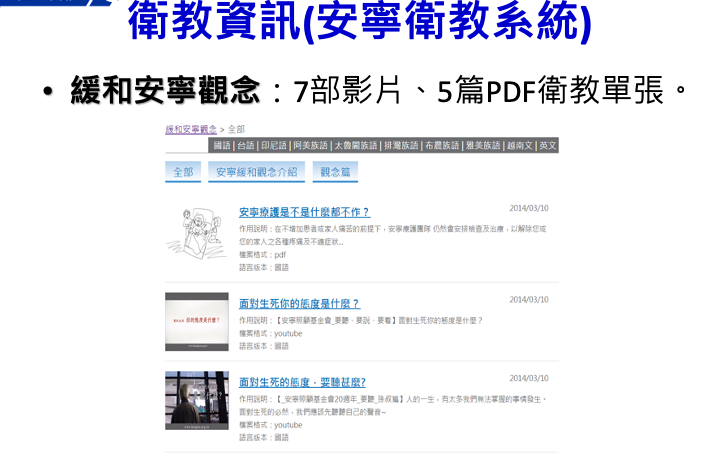 此外,安寧療護遠距整合性照護服務平台,還提供病人與照護者的多媒體衛教照護技巧影片,包含印尼、越南及太魯閣族、阿美族、布農族、排灣族、雅美族等原住民語系的語言可選擇,透過線上即時指導,也能協助沒有經驗的照護者。