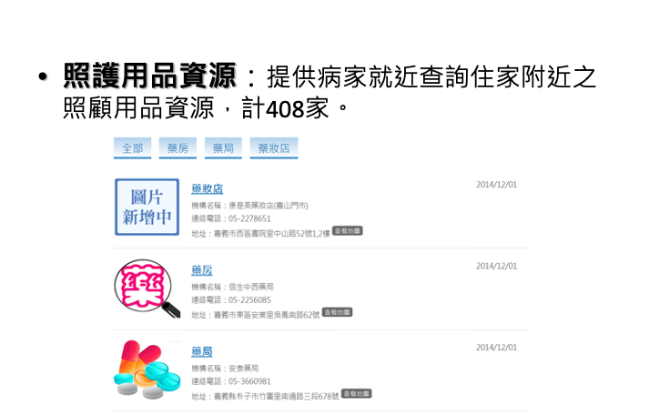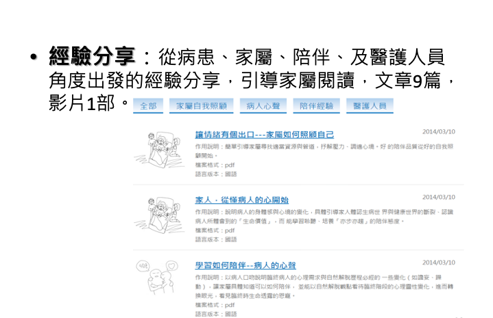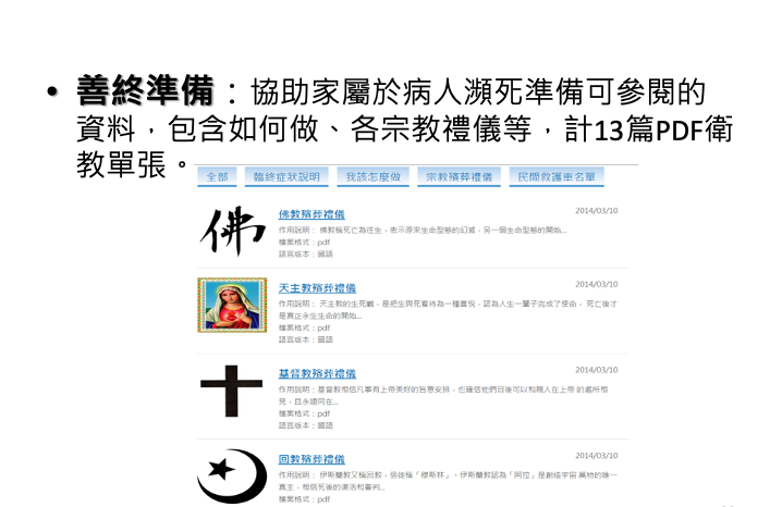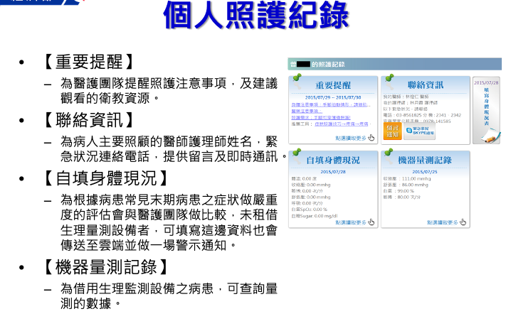 針對末期病患與照顧者為中心,設計整合雲端資訊與實體人性化服務之管理系統。透過雲端科技互動,將安寧病房延伸到居家照護,成為沒有圍牆的醫院。