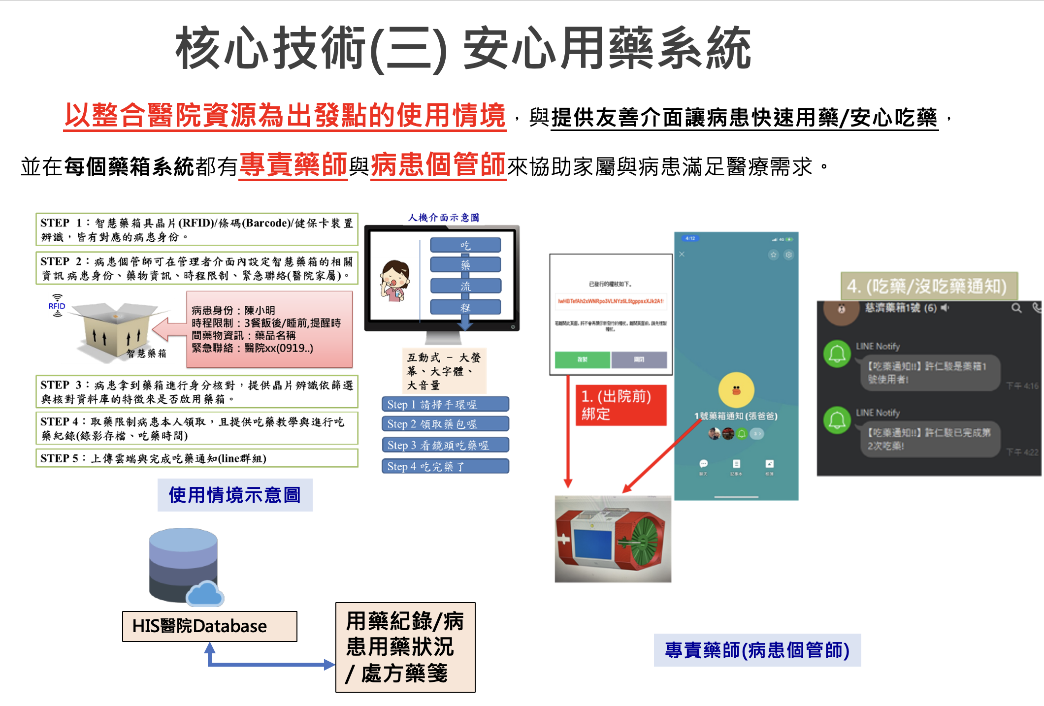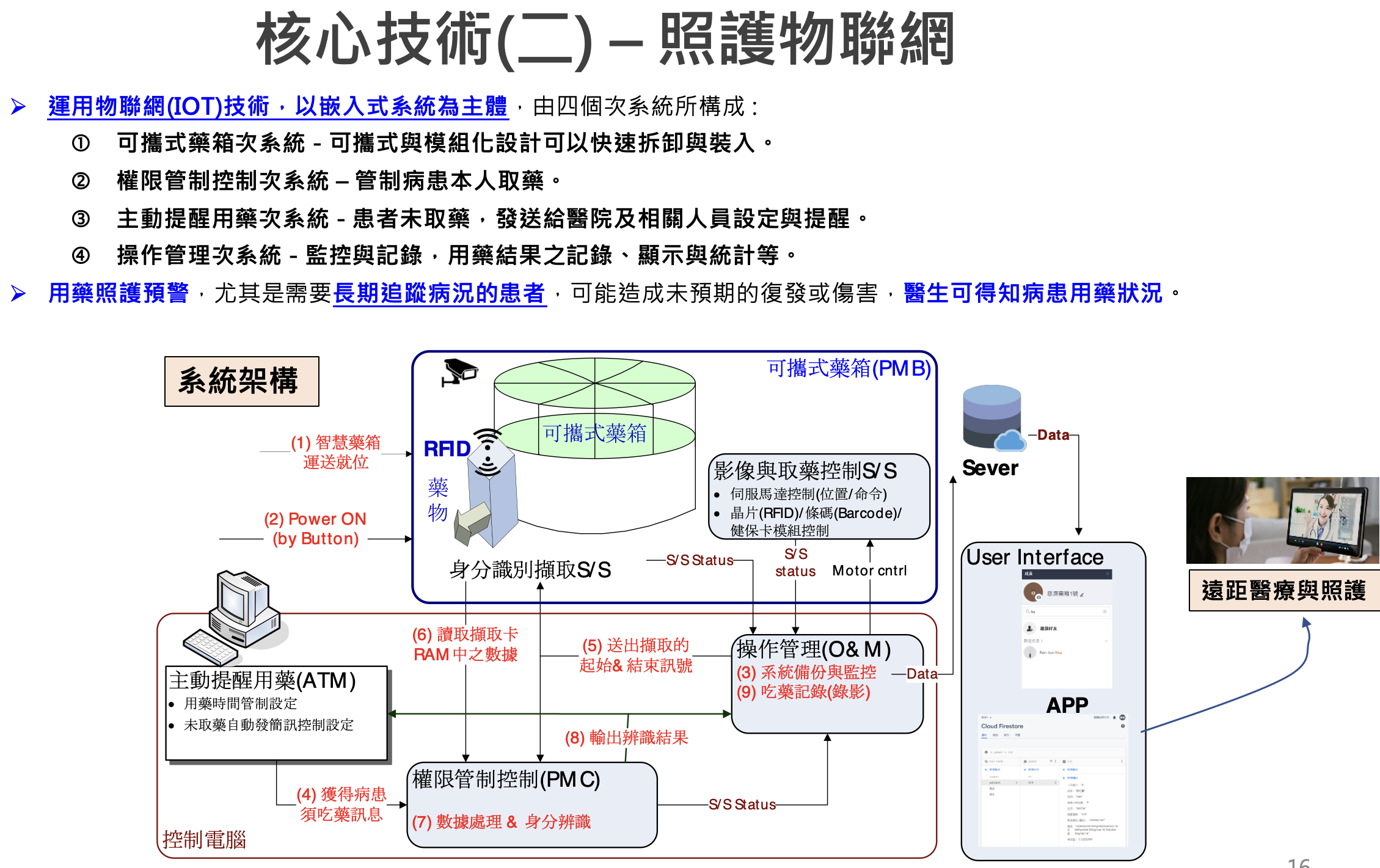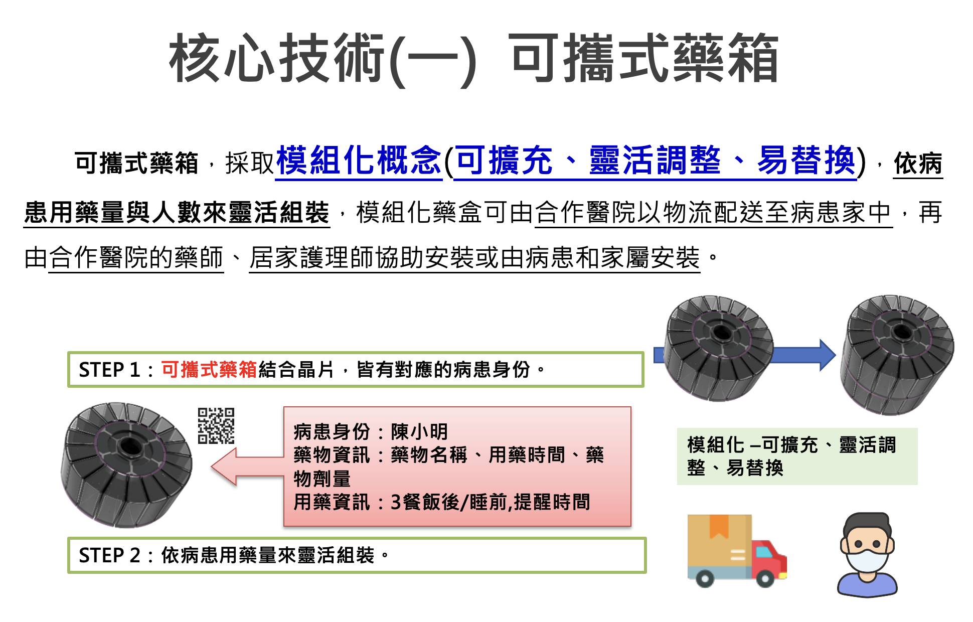 - 智慧藥箱系統結合權限管制技術、取藥機制與控制、主動提醒用藥與緊急聯繫記錄,異常用藥通報系統,模組化藥盒可由物流配送至病患家中。