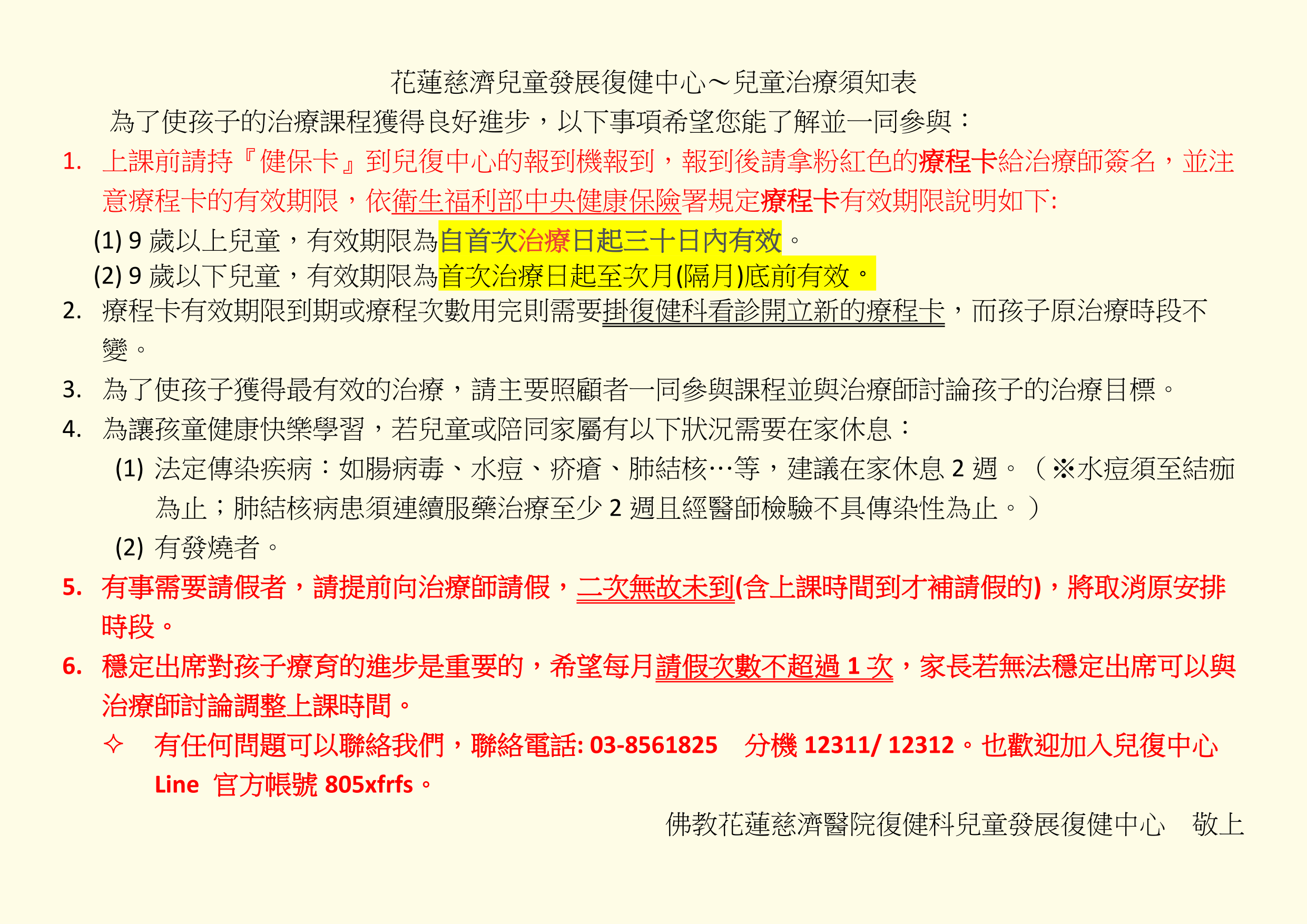 花蓮慈濟兒童發展復健中心自86年起承接兒童發展聯合評估中心計畫,我們有最完整的團隊成員,以團隊合作及以家庭為中心提供聯評服務。兒童完成評估後與家長說明評估結果,針對需要療育的孩子也會進一步安排相關課程,療育過程強調與家長合作,促進孩子各項的發展並提升在家庭或在校生活的參與。