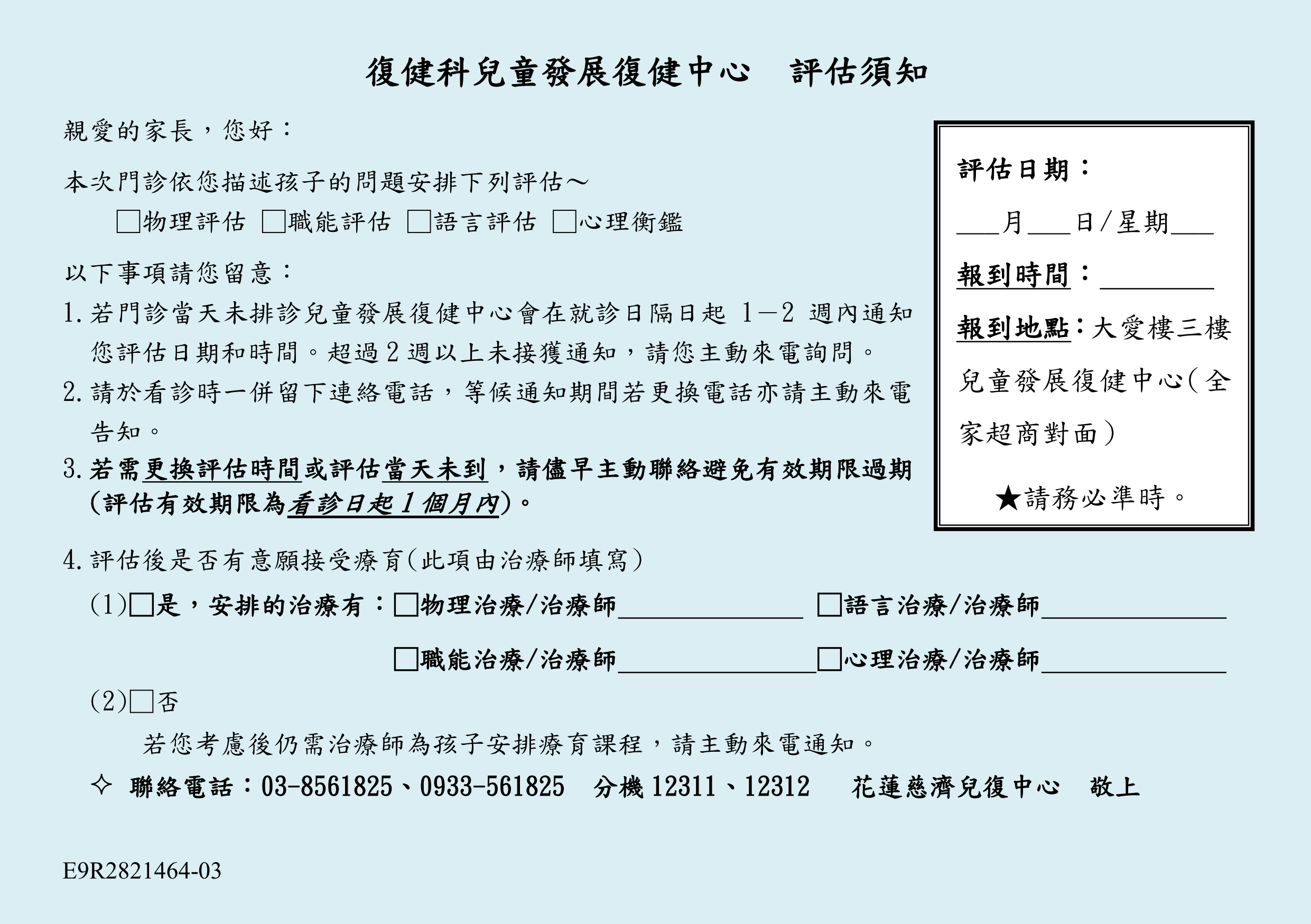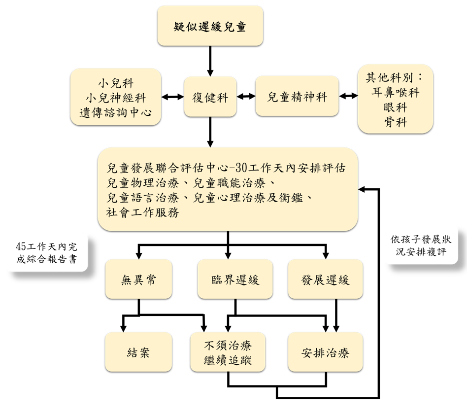 疑似發展遲緩兒童可以先至本院復健科看診,醫師會針對孩子問題提供相關檢查及評估,看診後家長可以安排適合的評估時間到聯評中心接受評估。