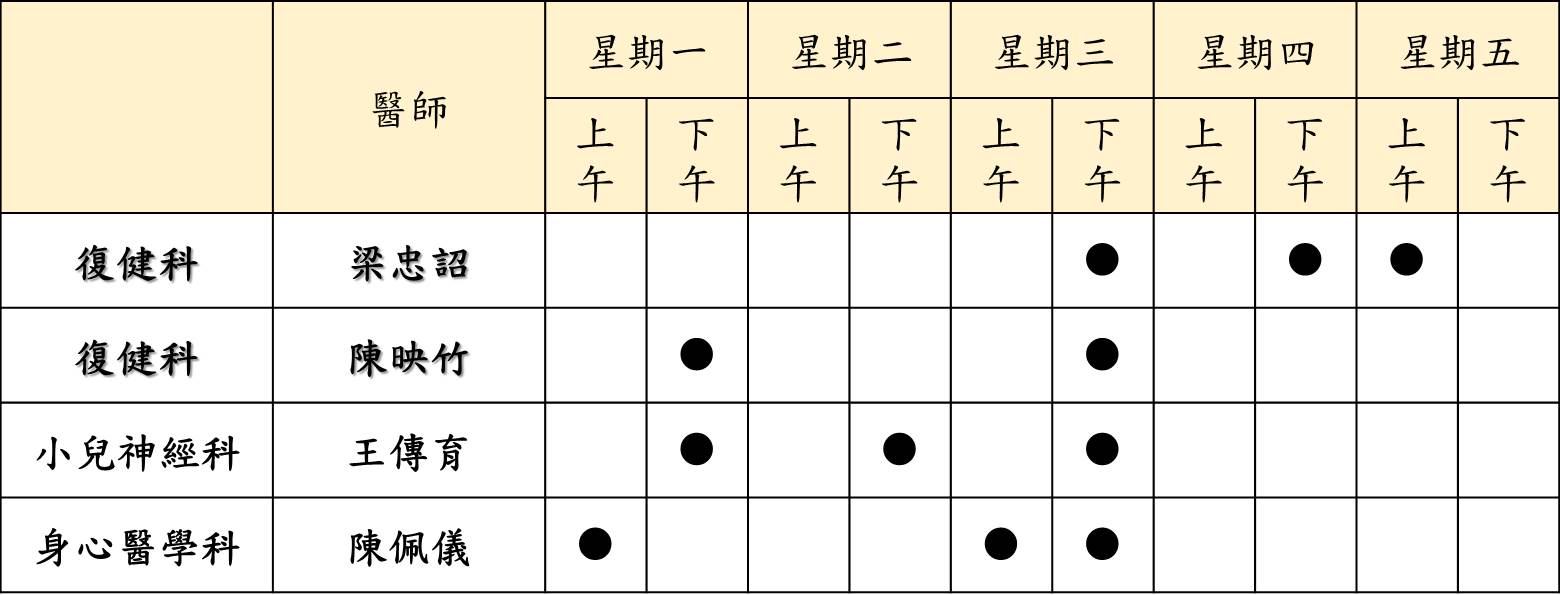 復健科醫師/ 小兒神經科醫師/兒童心智科醫師/兒童物理治療師/兒童職能治療師/ 兒童臨床心理師/ 兒童語言治療師/聽力師/社工師/ 個管師