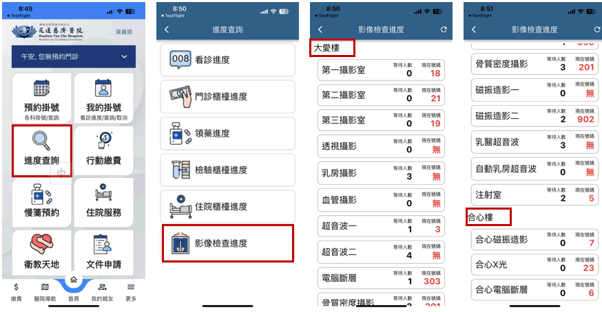 影像檢查進度查詢功能在"首頁進度查詢"可找到