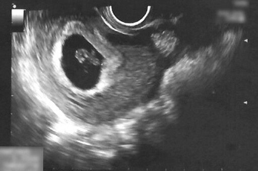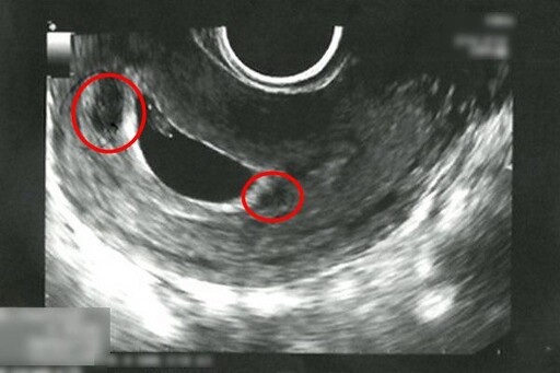 ▲陳女士懷孕第六週,透過超音波檢查發現子宮腔內出現血塊(紅圈處)。