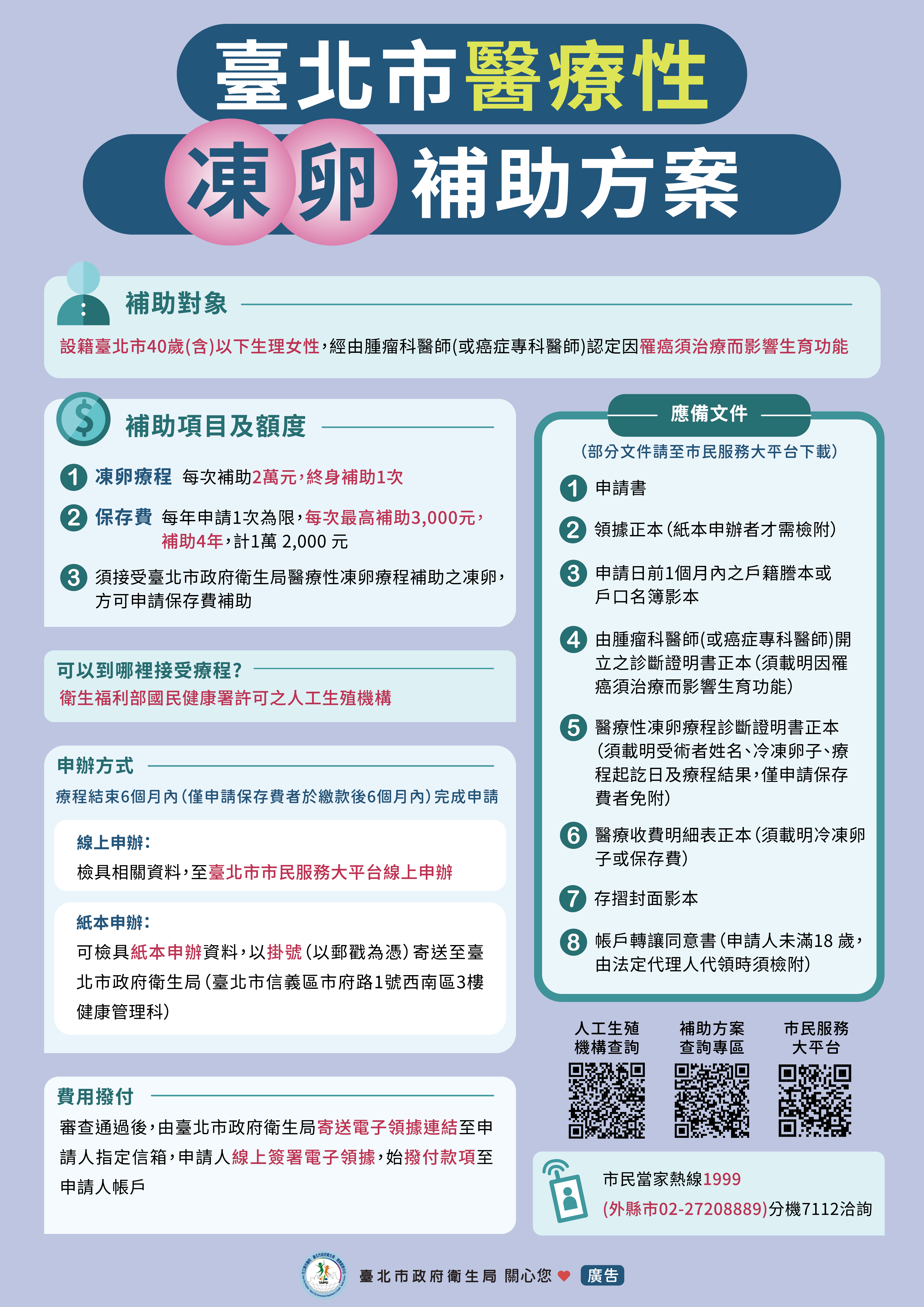 為鼓勵市民生育及保障罹癌婦女生育權益,本局自114年1月1日起辦理「人工生殖(試管嬰兒)加碼補助」、「醫療性凍卵補助」方案,請市民於申請前詳閱相關說明:
