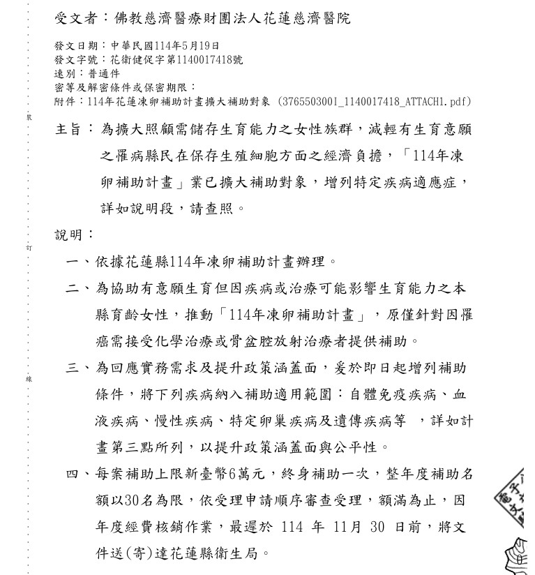 花蓮縣衛生局114年凍卵補助計畫,辦理時間即日起至114年11月30日前,向花蓮縣衛生局提出申請。
