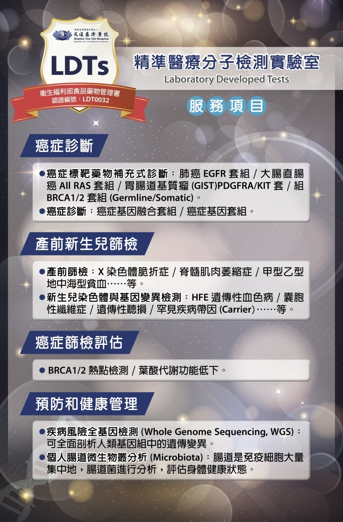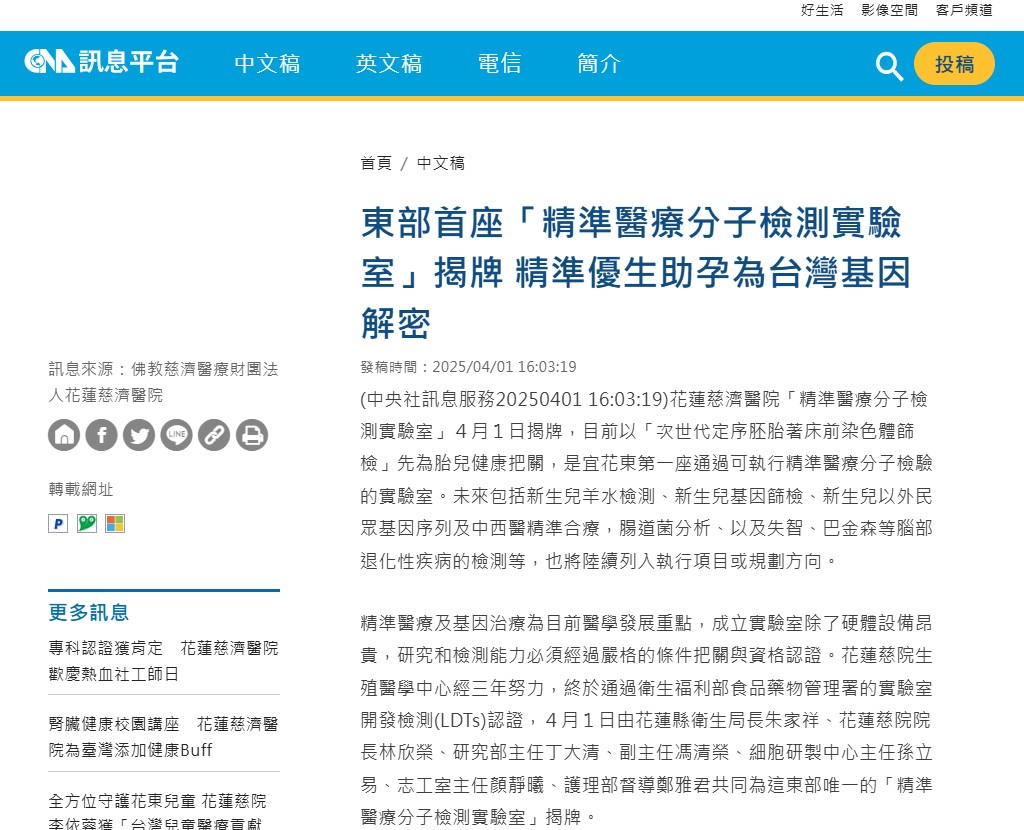 精準醫療及基因治療為目前醫學發展重點,成立實驗室除了硬體設備昂貴,研究和檢測能力必須經過嚴格的條件把關與資格認證。花蓮慈院生殖醫學中心經三年努力,終於通過衛生福利部食品藥物管理署的實驗室開發檢測(LDTs)認證,4月1日由花蓮縣衛生局長朱家祥、花蓮慈院院長林欣榮、研究部主任丁大清、副主任馮清榮、細胞研製中心主任孫立易、志工室主任顏靜曦、護理部督導鄭雅君共同為這東部唯一的「精準醫療分子檢測實驗室」揭牌。