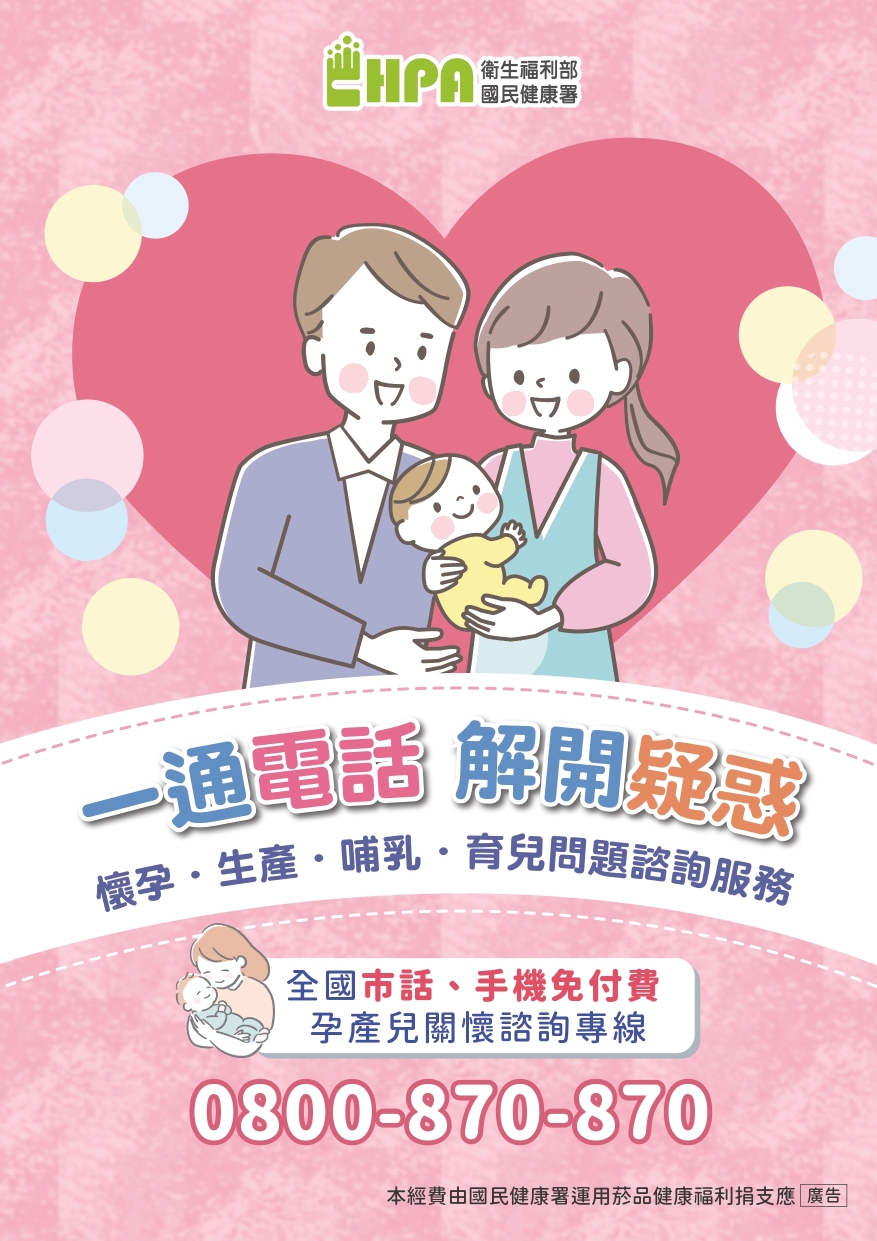 全國市話、手機免付費 孕產兒關懷諮詢專線: 0800-870-870
