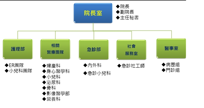本院為提供健全的兒少保護業務,在政策上設置院層級的保護性個案醫療服務委員會中另設立兒少保護小組,由兒科團隊為主導,規畫之疑似重大兒虐個案院內流程圖(下圖) 運作。兒保醫療中心於109年已納入常規的業務報告範圍,對於強化院內高層對於兒保醫療中心的服務支持及縣內兒虐議題的了解有突破性的改變。