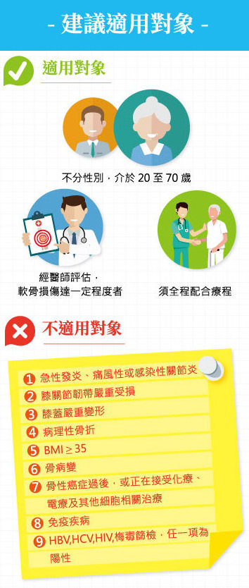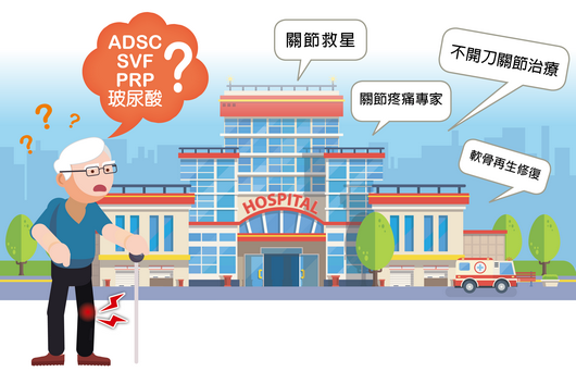 在更換人工關節之前還有其他的選擇嗎?本院現在運用再生醫學,可幫助受損軟骨修復及改善疼痛。常見如PRP(高濃度血小板血漿)被廣為使用外,目前更有BMAC(骨髓濃厚液),除了可提供生長因子幫助再生外,也可有效的抑制發炎反應,明顯降低病人患部的不適及疼痛感。更有「自體單核球細胞療法(PCP)」作為中後期退化性關節炎治療新選擇。另外本院通過衛福部特管法之「自體骨髓間質幹細胞」以及「自體脂肪幹細胞」治療退化性關節炎,可有效減輕疼痛、改善生活品質,讓您行動自如,延緩更換人工關節時間。