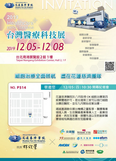 12月5日至8日,花蓮慈濟醫院與尖端醫、國璽幹細胞、美商永生、長弘生技、羅麗芬控股暨麗瑞嘉生技、怡忠科技、商之器科技、台灣安進藥品、晁禾醫療等多家生技公司、以及在護理創新研發屢受肯定的慈濟科技大學聯展(南港展覽館2館1樓,攤位P514),有細胞治療、癌症與再生醫療、新藥研發、創新醫材及智能設備、智慧醫療、國際醫療等主題,還有免費骨質疏鬆檢測、中醫耳穴健檢及O環試驗服務。