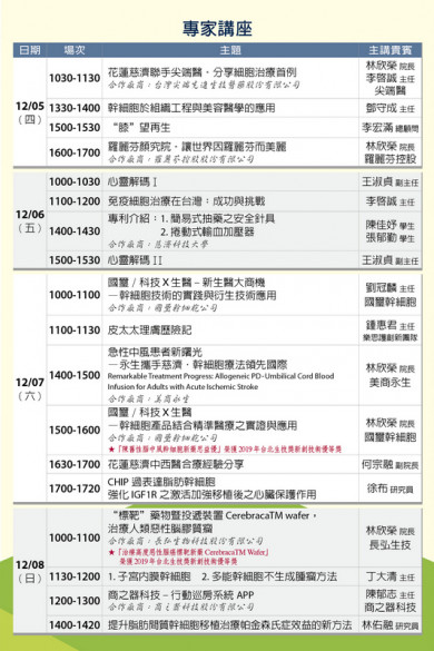 在這次台灣醫療科技展中,花蓮慈院精準醫學中心主任李啟誠將分享免疫細胞療法治療血癌新趨勢、骨科劉冠麟醫師與國璽幹細胞公司將分享間質幹細胞治療退化性關節炎多項細胞療法技術,以及林欣榮院長與長弘生技聯合分享「標靶」新藥暨投遞裝置治療高度惡性腦膠質瘤,這項研究技術榮獲2019年台北生技獎新創技術優等獎肯定。此外,美商永生公司委託花蓮慈院進行「人類臍帶血單核細胞靜脈注射治療急性缺血性腦中風」第一期臨床試驗,也在今年六月完成全球首例。這些主題都將在十八場特色醫療講座中與民眾分享。