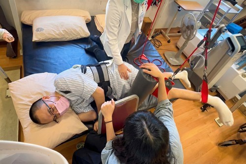 術後洺哲後轉往脊髓損傷神經中心,由神經外科部蔡昇宗主任接手。洺哲記得自己還在插管時,中西醫合療就已經搶在黃金治療期介入,在病床上中醫部針灸科林郁甯主任及團隊就開始會診進行針灸,物理治療師吳明勇帶領他做有助神經恢復的各項復健。