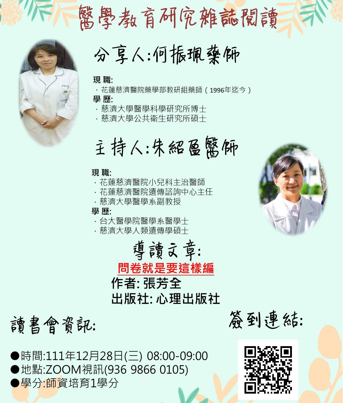 醫學教育研究雜誌閱讀【星期三】12/28(三)上午08:00-09:00何振珮藥師主講,採線上視訊會議舉辦,歡迎有興趣的同仁踴躍報名參加!