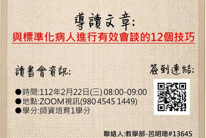 112/2/22(三)醫學教育讀書會-與標準化病人進行有效會談的12個技巧-曾寶慧主任