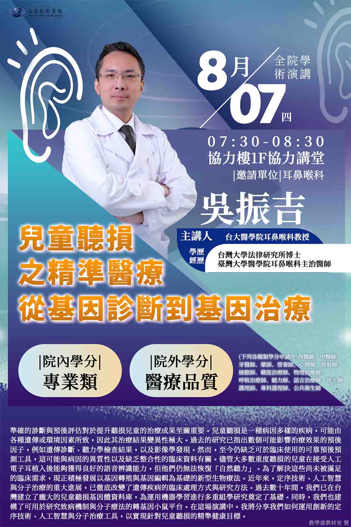 114.08.07 全院學術演講-兒童聽損之精準醫療從基因診斷到基因治療-吳振吉教授