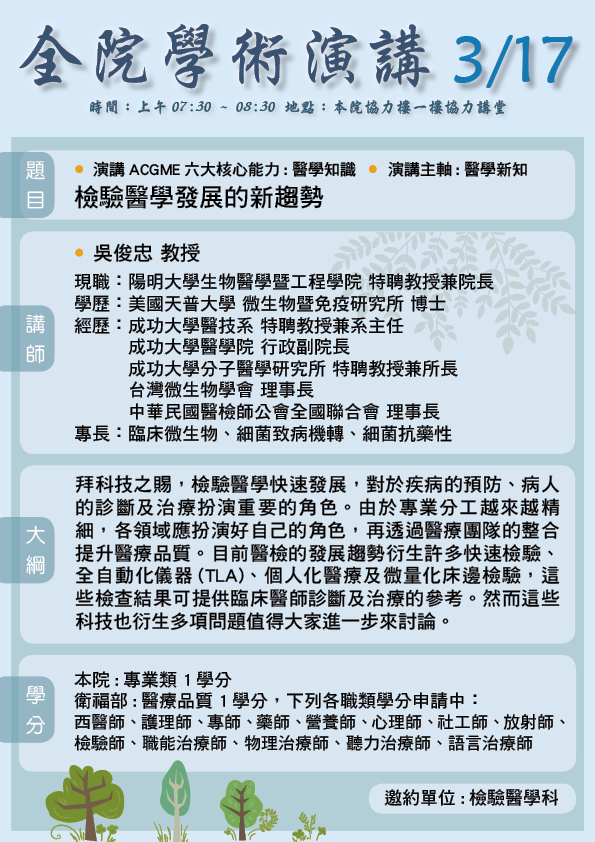 105.03.17【全院學術演講】檢驗醫學發展的新趨勢|吳俊忠教授