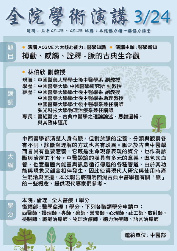 105.03.24【全院學術演講】搏動、感觸、詮釋-脈的古典生命觀|林伯欣副教授